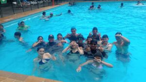 Pronto, el bullicio se trasladó a la piscina. Allí los estudiantes reían, se lanzaban agua y saltaban sin miedo, recordándonos que “cada instante de alegría también educa el corazón”. El agua, fresca y clara, se convirtió en un espejo de la vitalidad de los jóvenes que entienden que crecer no es dejar de jugar, sino aprender jugando, que reír es bueno para la salud y el alma, nos da fuerzas y forja una luz de esperanza.